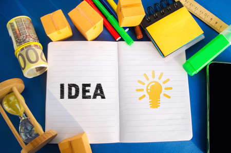 Notebook with word Idea and light bulb idea icon. Concept of new innovation ideas and discoveries. Vision, planning. Strategy and management. Business and finance. Flat lay