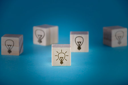 Multiple wooden cubes with light bulb icons on a deep blue background, one of them is on, depicting brainstorming and concept development.