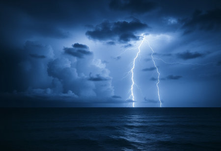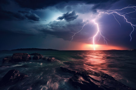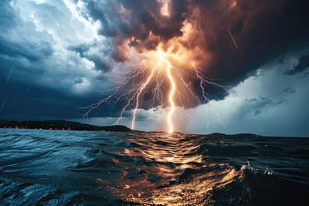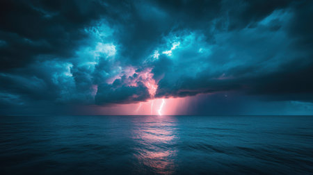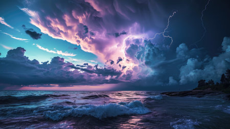 A captivating storm scene showcasing dark clouds illuminated by powerful lightning strikes over tumultuous ocean waves, evoking nature's raw power.