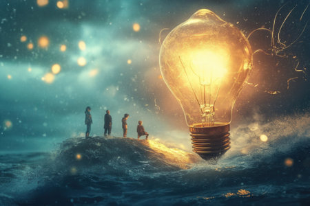 Businesspeople observing giant illuminated light bulb emerging from ocean waves at night