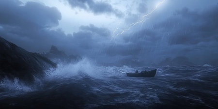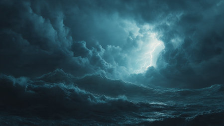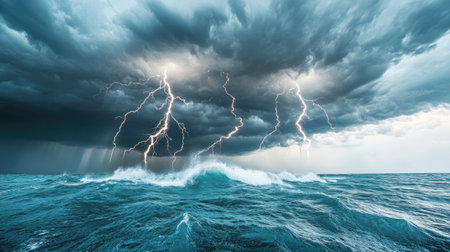 Turbulent ocean waves crash violently under a dark, stormy sky with dramatic lightning illuminating the chaotic...