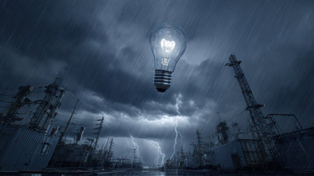 Under dark clouds and rain a massive light bulb shines brightly over an assembly line celebrating New Year amidst a stormy backdrop.