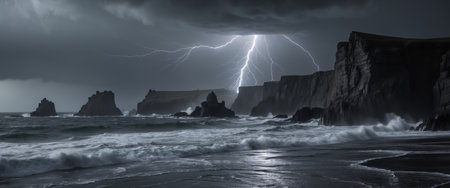 Thunderous waves crash against the shore as a powerful storm brews in the background. Striking lightning illuminates the turbulent clouds, creating a dramatic atmosphere.