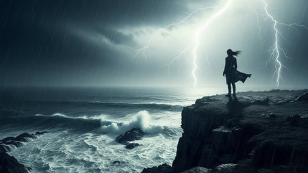 Determined Person standing in front of storm. Sea sunset. Generate Ai