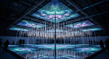 A person stands in awe in front of a mesmerizing display of sparkling lights, Cluster of holographic projections transformed into an abstract display, AI Generated