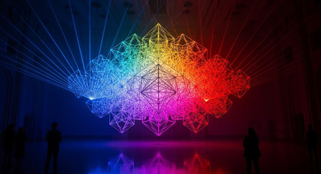 Numerous figures are seen silhouetted against a vibrant backdrop of colored light. The image showcases vertical bands of color that reflect off a smooth, dark surface, creating a dynamic visual. The composition and lighting suggest a contemporary art installation or exhibit, suitable for various editorial and design projects.
