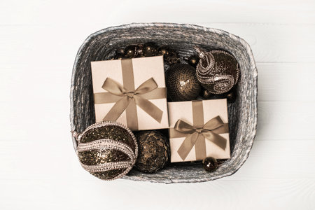 Elegant holiday gift boxes with bronze decorations in a woven basket