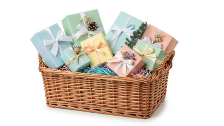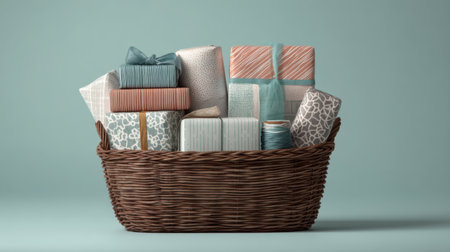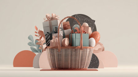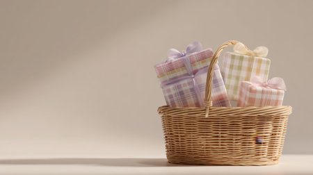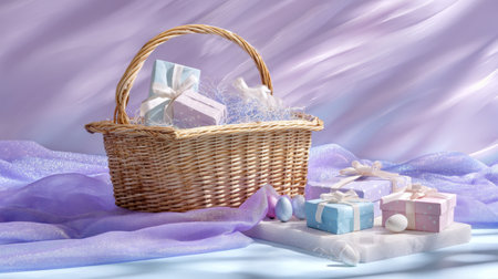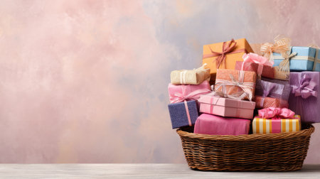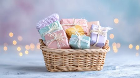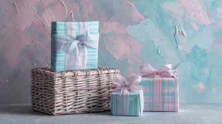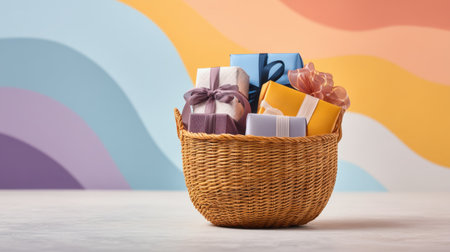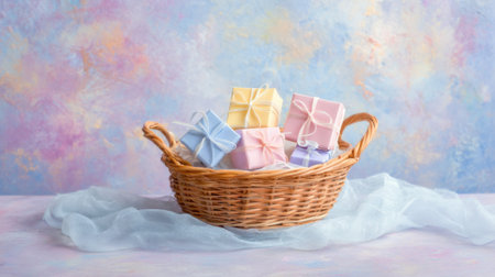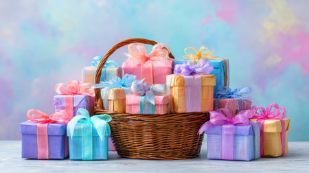 A charming scene featuring a wicker basket filled with colorful wrapped gifts on a soft pastel background, perfect for celebrations, holidays, or special occasions.