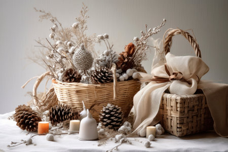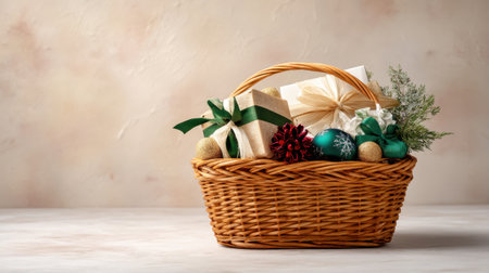 This image showcases an elegant gift basket filled with beautifully wrapped presents and natural decorations, perfect for adding warmth and charm to any festive celebration.