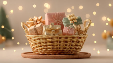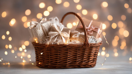 A charming wicker basket brimming with elegantly wrapped gifts surrounded by soft fairy lights, creating a warm and inviting atmosphere perfect for holiday celebrations.