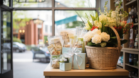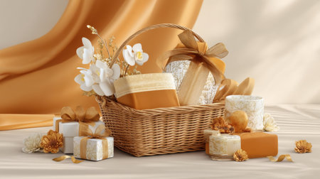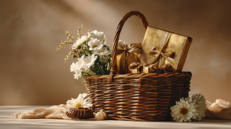 This charming wicker basket features a delicate arrangement of flowers and beautifully wrapped gifts, perfect for celebrations and special moments, creating a serene setting.