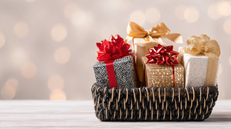 A charming arrangement of beautifully wrapped gifts in a stylish basket, featuring various bows and a sparkling background that enhances the festive atmosphere.