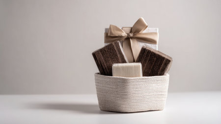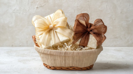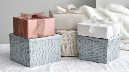 This charming gift basket showcases elegantly wrapped presents adorned with soft ribbons, perfect for celebrations and special occasions in a minimalist setting.