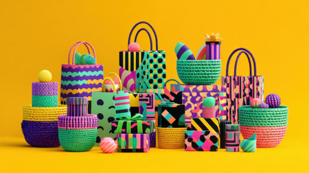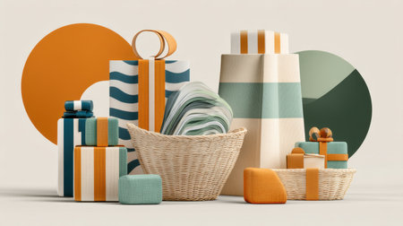 A vibrant arrangement of wrapped gifts and decorative baskets in a minimalist style. This composition highlights playful colors and patterns, perfect for festive occasions.