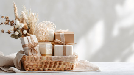 A rustic basket holds beautifully wrapped gifts with delicate ribbons, accompanied by dried flowers. The soft natural light creates a warm and inviting atmosphere.