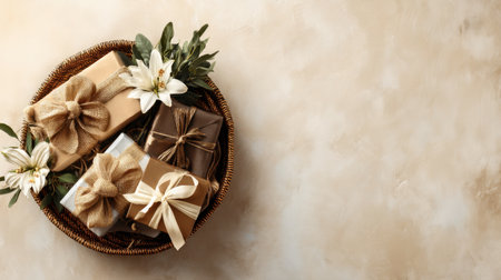 This image features an elegant arrangement of beautifully wrapped gifts in a woven basket, accompanied by soft flowers, embodying a warm festive atmosphere perfect for celebrations.