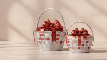 Two beautifully arranged gift baskets with red satin bows, perfect for celebrations, add elegance and charm to any festive occasion, enhancing your decor.