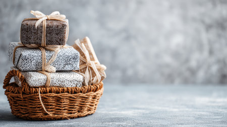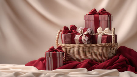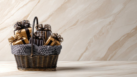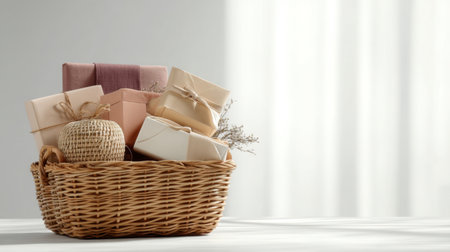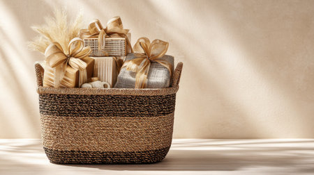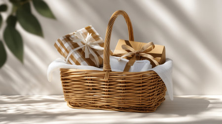 A charming wicker basket filled with elegantly wrapped gift boxes. The natural light casts gentle shadows, creating a cozy and inviting atmosphere perfect for celebrations.