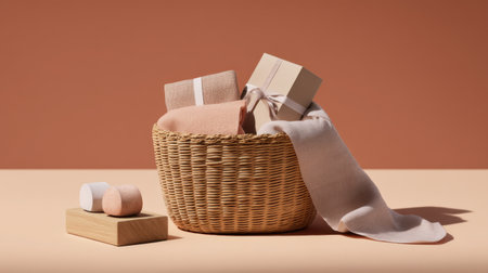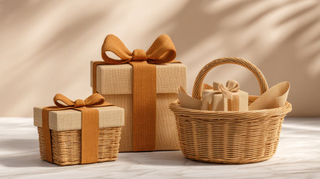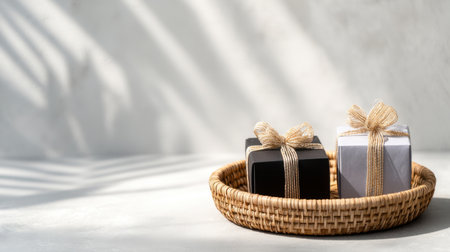 A serene arrangement of elegantly wrapped gift boxes in a woven basket, enhanced by soft shadows cast on a neutral background, creating a minimalist aesthetic.