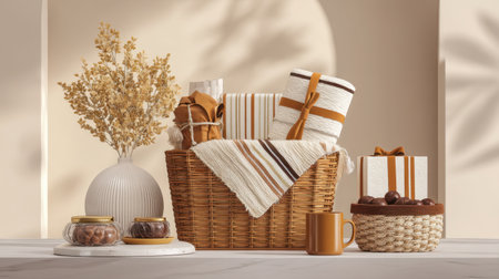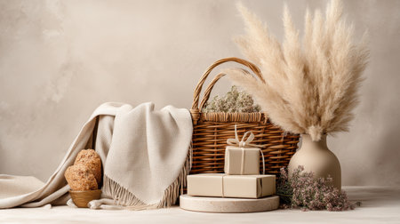 This image features a warm and inviting arrangement of gifts, a basket, dried flowers, and snacks, set against a soft neutral backdrop, perfect for seasonal celebrations.