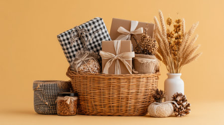 A beautifully arranged gift basket filled with wrapped presents, decorative jars, and dried flowers against a warm yellow background, perfect for gifting and seasonal celebrations.
