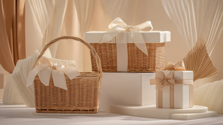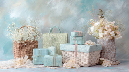 This image features a beautiful arrangement of gift baskets and boxes with elegant ribbons, set against a soft pastel background, perfect for festive occasions.