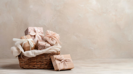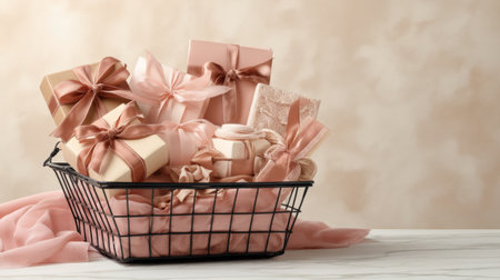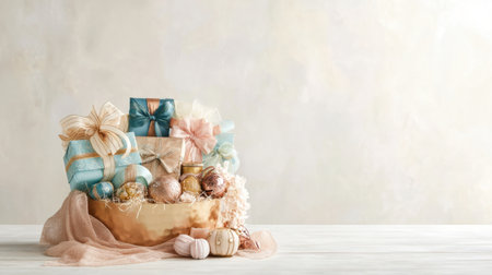 This image features a stylish gift basket filled with intricately wrapped presents in soft pastel shades, creating a warm and inviting atmosphere ideal for any celebration.