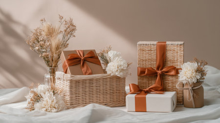 Discover a beautiful arrangement of gifts wrapped in warm tones and elegant ribbons, set against a minimalist backdrop. Perfect for celebrations and special occasions.