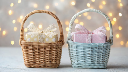 Two beautifully woven baskets hold pastel gift boxes adorned with ribbons, set against a soft bokeh background, evoking warmth and celebration for any occasion.