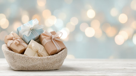 A charming basket filled with colorful wrapped gifts creates a festive atmosphere, perfect for celebrations and special occasions showcased against soft bokeh lights.