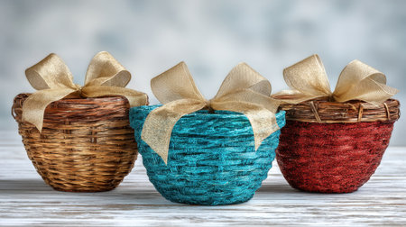 Three beautifully crafted woven baskets in different colors adorned with golden ribbons. Perfect for gifts, home decor, or festive occasions, adding charm and elegance.