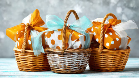 A collection of elegantly wrapped gift baskets in various textures and tones, perfect for festive occasions and enhancing any celebration's ambiance.