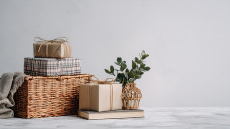 This serene composition features wrapped gifts in soft tones, a wicker basket, and a decorative plant. Ideal for holiday themes, cozy home decor, or gift-giving inspiration.