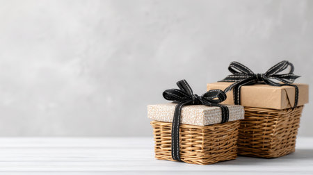 Two elegant gift boxes with black ribbons sit on a light wooden surface against a soft gray background. Ideal for holiday or special occasion themes.