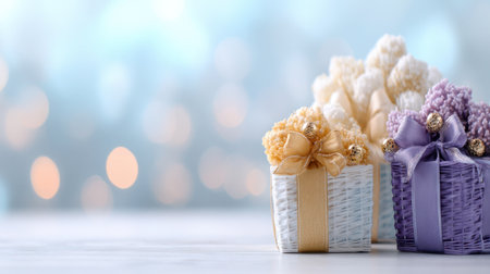Delightful gift baskets featuring beautifully wrapped presents adorned with golden bows, set against a soft bokeh backdrop, perfect for festive occasions and celebrations.