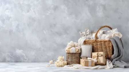 A beautiful arrangement featuring a cozy basket filled with decorative gifts and soft textiles against a sophisticated gray backdrop, perfect for seasonal decor inspiration.