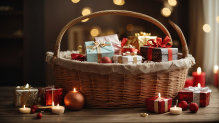 An elegant wicker basket overflowing with beautifully wrapped presents, perfect for enticing gift-giving moments or enhancing festive celebrations in a warm setting.