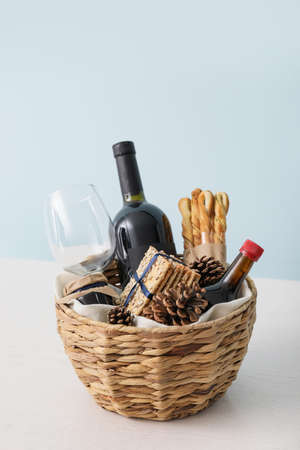Basket with gifts on the background of the Christmas tree and fireplace