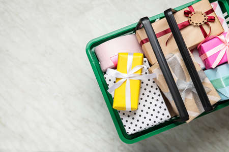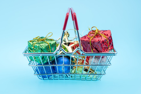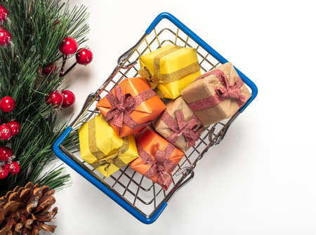 Shopping basket full of christmas gifts wrapped in festive paper with firtree branch isolated on white background.