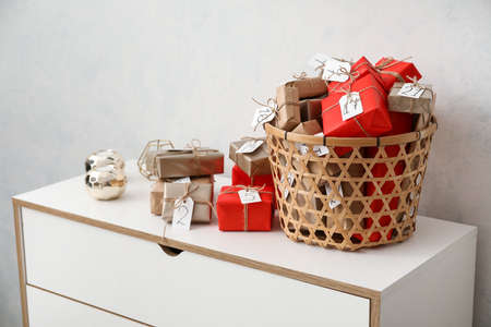 Christmas advent calendar with gift boxes in basket and candles on chest of drawers