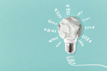 crumpled white paper lightbulb with inscription idea around on a blue background