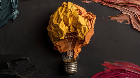 Crumpled paper in vibrant colors forms light bulb, symbolizing creativity and innovation. contrasting textures and colors evoke sense of inspiration and artistic expression