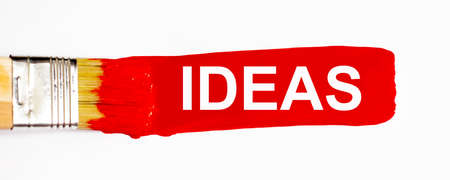 Concept of idea, creativity, start up or brainstorming. The word idea and bulb drawn on red toy rectangular blocks against bright blue background with copy space.