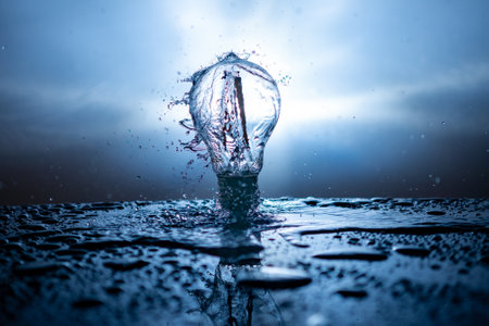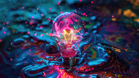 A glowing light bulb floats above a textured water surface, creating a captivating interplay of colors and reflections, symbolizing creativity and innovation.