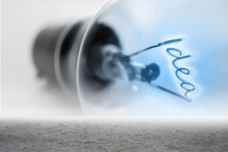 Light bulb with glowing Idea text on blurred bokeh background with free place. Education, solution, business, thought, brainstorming concept