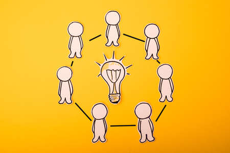 Three male hands drawing a light bulb with puzzle pieces in the middle in a conceptual image of vision and teamwork. Over yellow background.