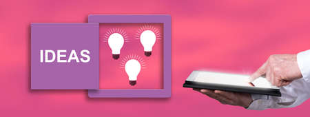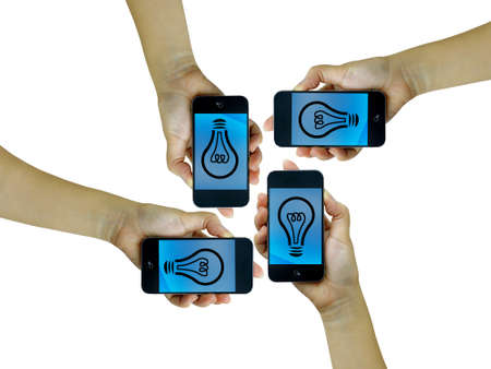 Business Idea and Technology Concept. Closeup of woman hand holding wooden light bulb icon and mobile smartphone.