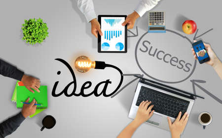 Generative AI : Top view of diverse people of creative team group using smartphone tablet and computer laptop Overhead of asian young creative start up meeting Have copy space for