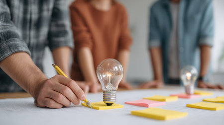 A group of individuals engages in a collaborative brainstorming session, utilizing sticky notes and a light bulb as symbols of creativity and innovation in their workspace.