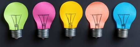 Colorful sticky notes shaped like light bulbs create a unique visual display on a dark surface.